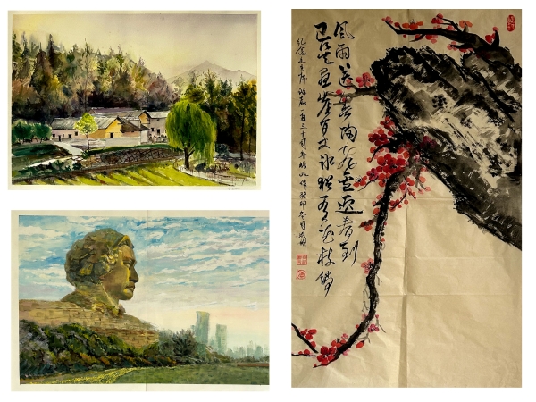 绘画作品种类繁多,包括水墨、水粉、素描等。同学们用自己的方式表达对毛泽东同志以及老一辈革命先烈的崇高敬意。水墨画《数风流人物,还看今朝》表达了毛泽东伟大的抱负和雄心壮志;水粉画《三军过后尽开颜》表现出红军历尽艰难险阻,取得长征胜利的喜悦心情;油画《橘子洲头》再现了青年时期毛泽东胸怀大志、风华正茂的气概。