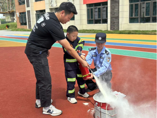 演练后,幼儿园园长说:“小朋友们,今天咱们的钟羽澄小朋友为了此次演习,换上了消防员的衣服,来给大家演示一下如何使用灭火器,大家说好不好!”随后钟羽澄小朋友同社区工作人员和民警一起,“一摇、二对、三拔、四压”,粉末直冲火源桶,扑灭火焰的同时,也在小朋友们心里埋下安全的种子。