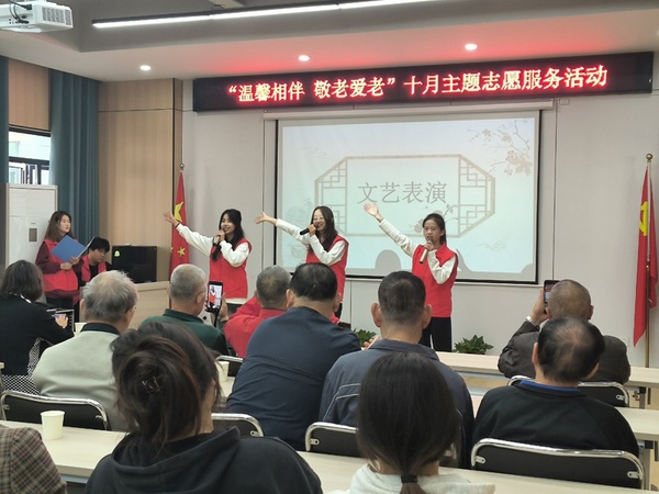 活动首先举行的是小型文艺节目。志愿者用悠扬的歌声传递着对老年人的深情祝福;用曼妙的舞姿,为老年人带来了视觉上的享受,让他们感受到了艺术的魅力和生活的美好。