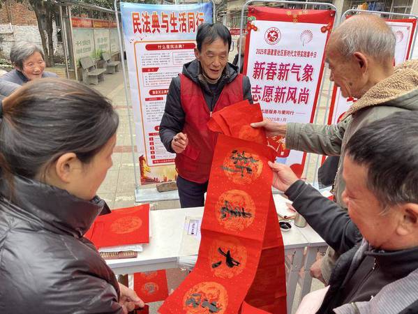 为了让居民们更好地感受传统节日的魅力,活动现场还特别邀请了书法爱好者和书法协会的志愿者开展“写春联送祝福”的活动。来自湖北理工学院的书法爱好者巫东攀一边挥毫泼墨,一边说:“能为邻居们写上一副寓意美好的春联,我觉得特别有意义。通过这种方式,我们可以传递出更多的温暖和关怀。”