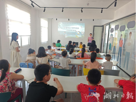 在桐厂社区暑假“爱心托管班”开班仪式上,来自湖北师范的5名大学生志愿者与社区28名小朋友齐聚一堂。社区党委书记为学员们带来开班第一课——防溺水安全教育。同时,讲解了托管班的注意事项和纪律要求。
